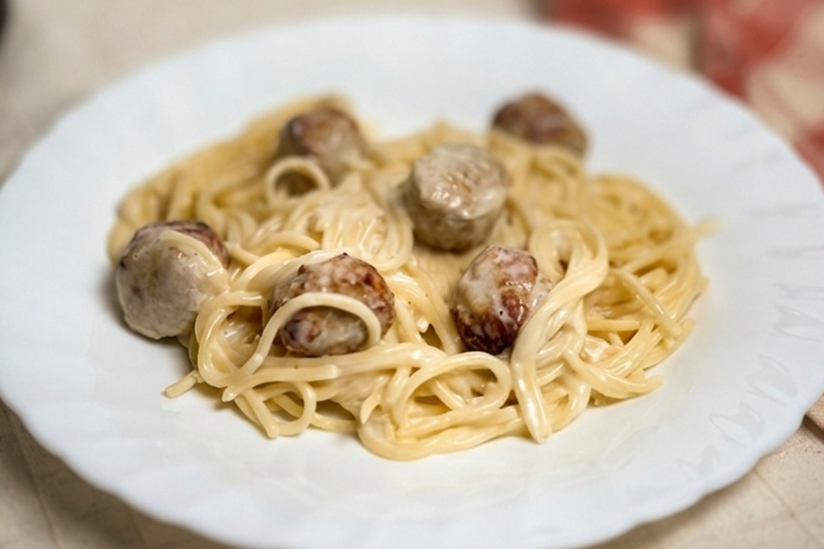 Кремовый соус «Альфредо», нежные куриные фрикадельки и паста — гармония сочных вкусов.