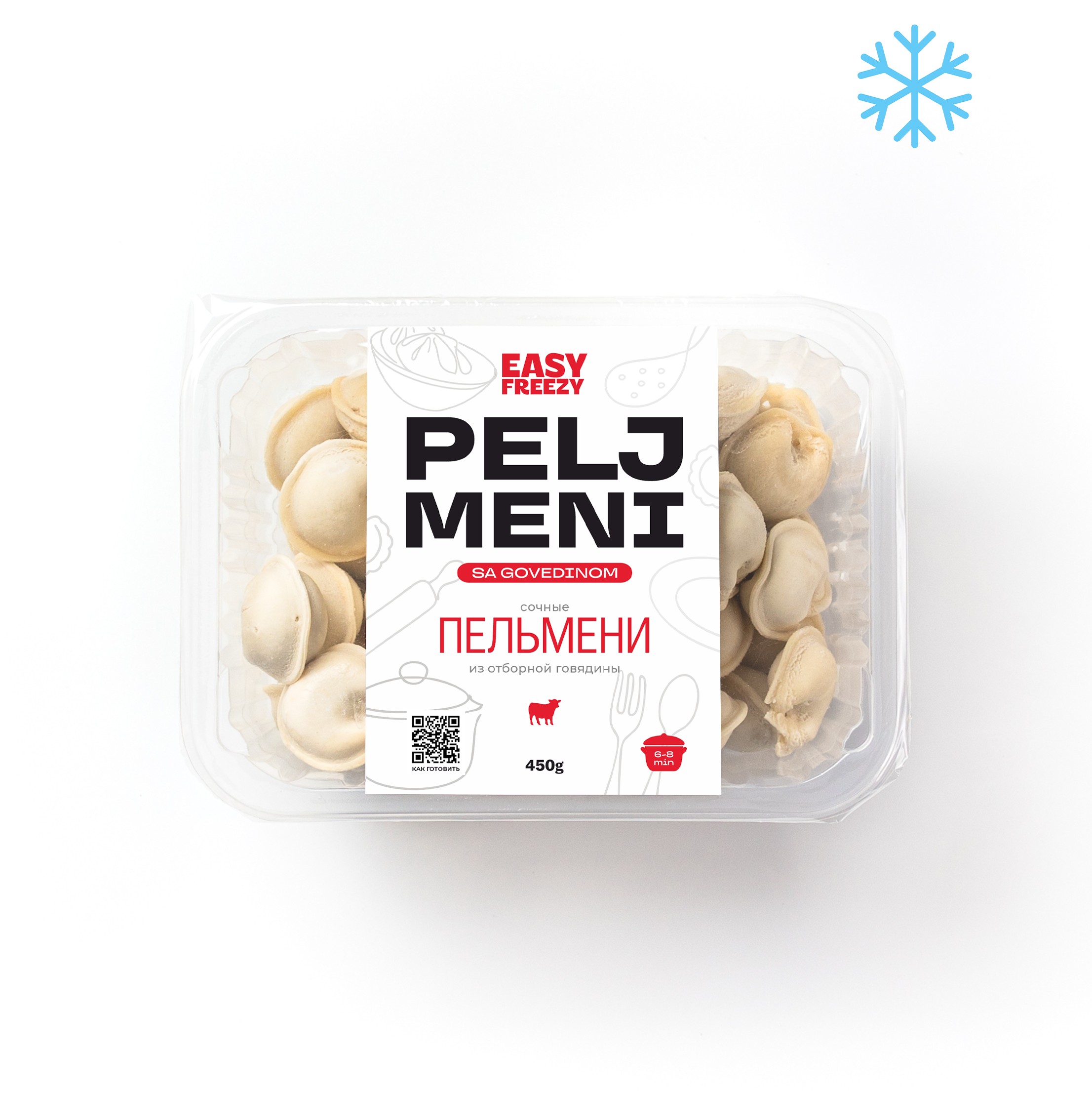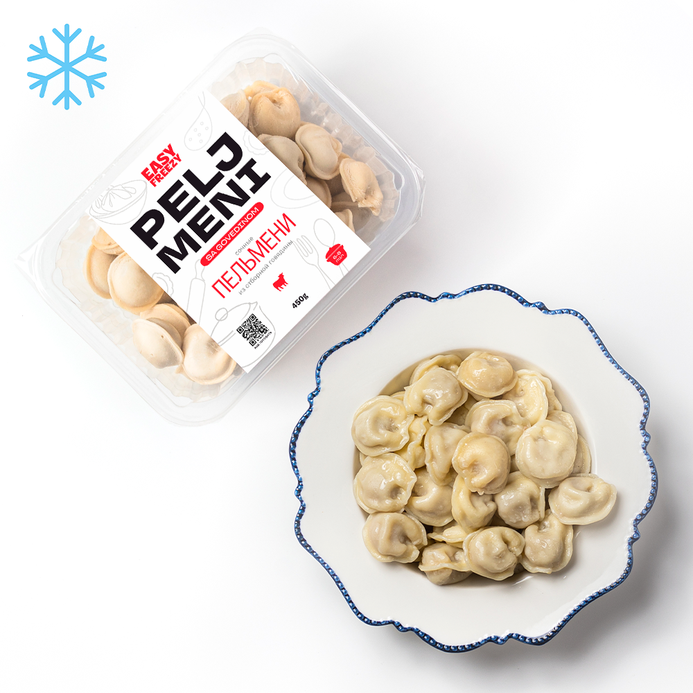 Пельмени с начинкой из отборной говядины. Тонкое тесто, сочная начинка с бульоном. Не развариваются и не слипаются при варке. Идеальны для сытного обеда или ужина.