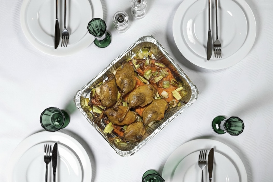 Утиные ножки конфи с гарниром из печёного батата и лука-порея 1800 г.