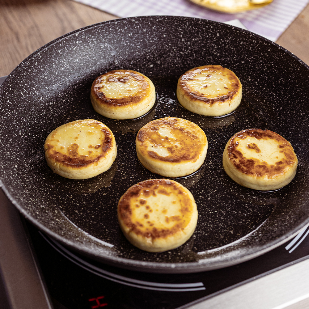 1. Достать из морозилки и обжарить замороженные сырники на умеренном огне по 2-4 минуты с каждой стороны до появления золотистой корочки на растительном масле.